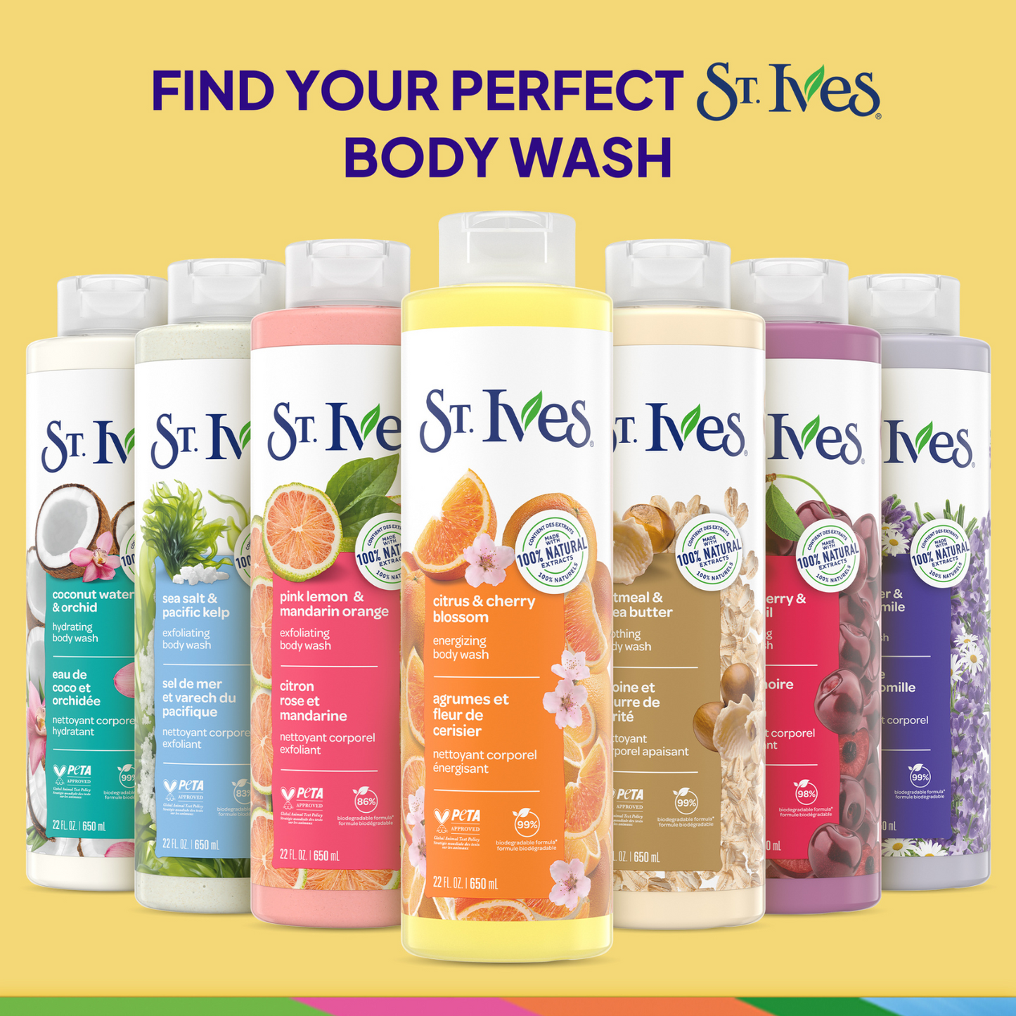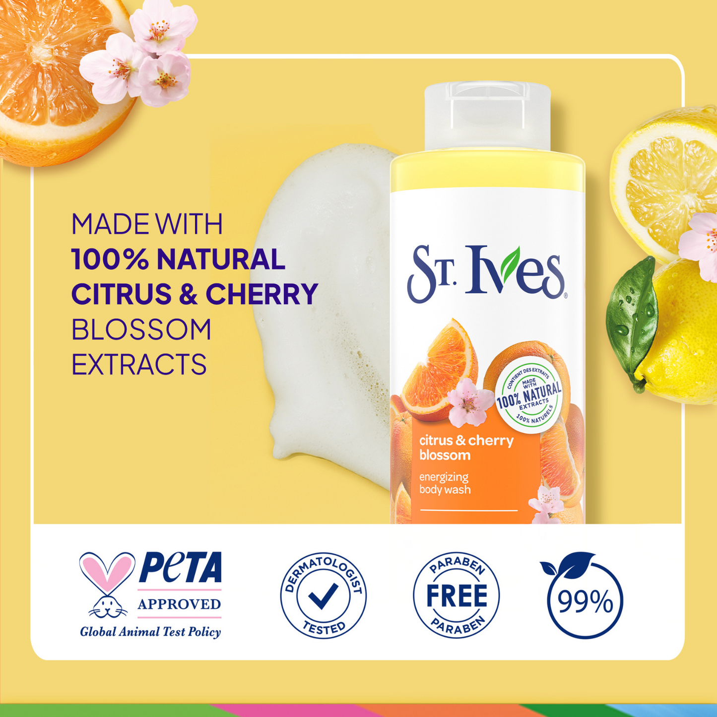 - Step into a shower of delicate sweetness with our citrus-cherry blossom bliss! St. Ives Energizing Citrus & Cherry Blossom body wash is your go-to for fresh skin that’s ready to tackle the day.